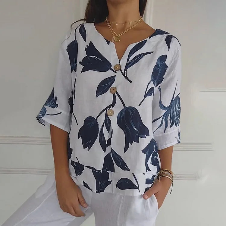 Jeanne | Elegante Blumenbluse – Zentrale Knopfleiste und kurze Ärmel