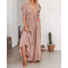 Dieses fließende Maxikleid bietet eine elegante und entspannte Silhouette. Der tiefe Ausschnitt betont die Figur. Perfekt für sonnige Tage oder sommerliche Abende.