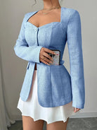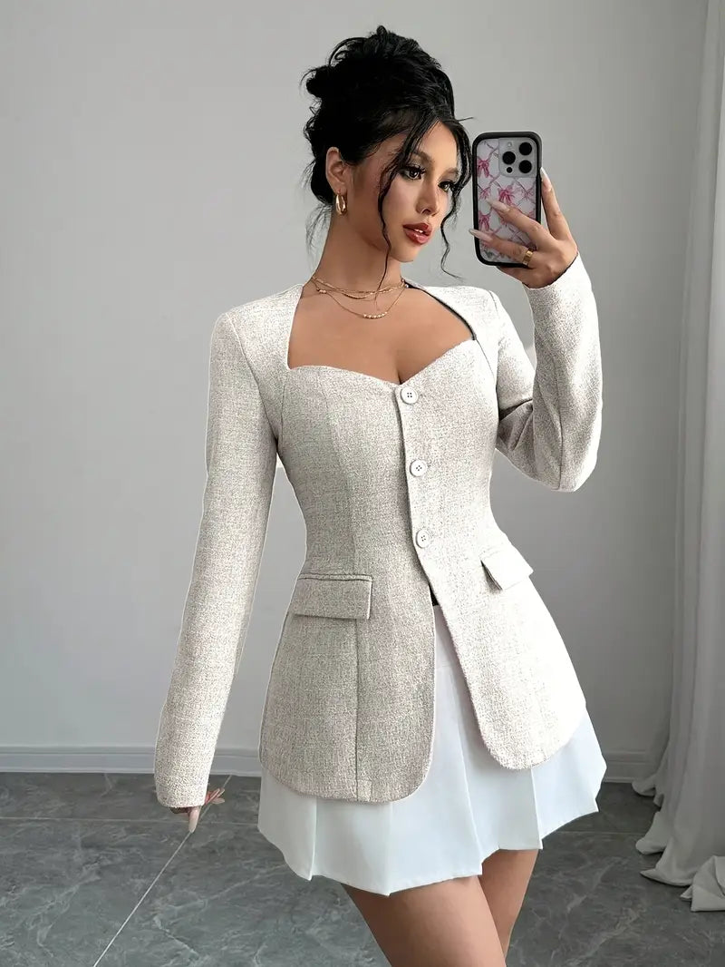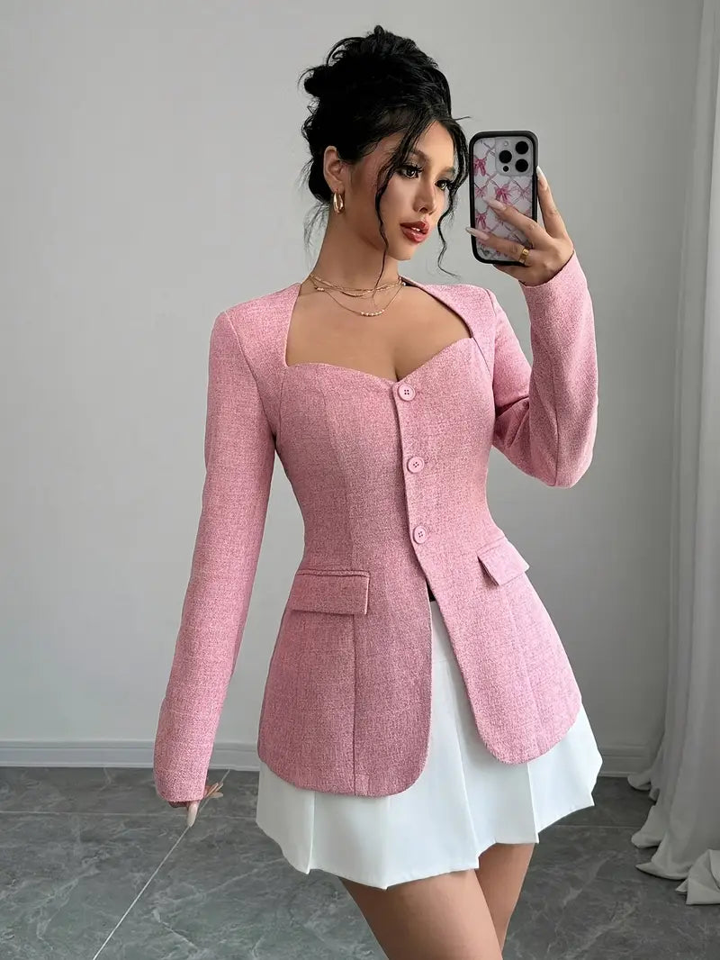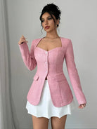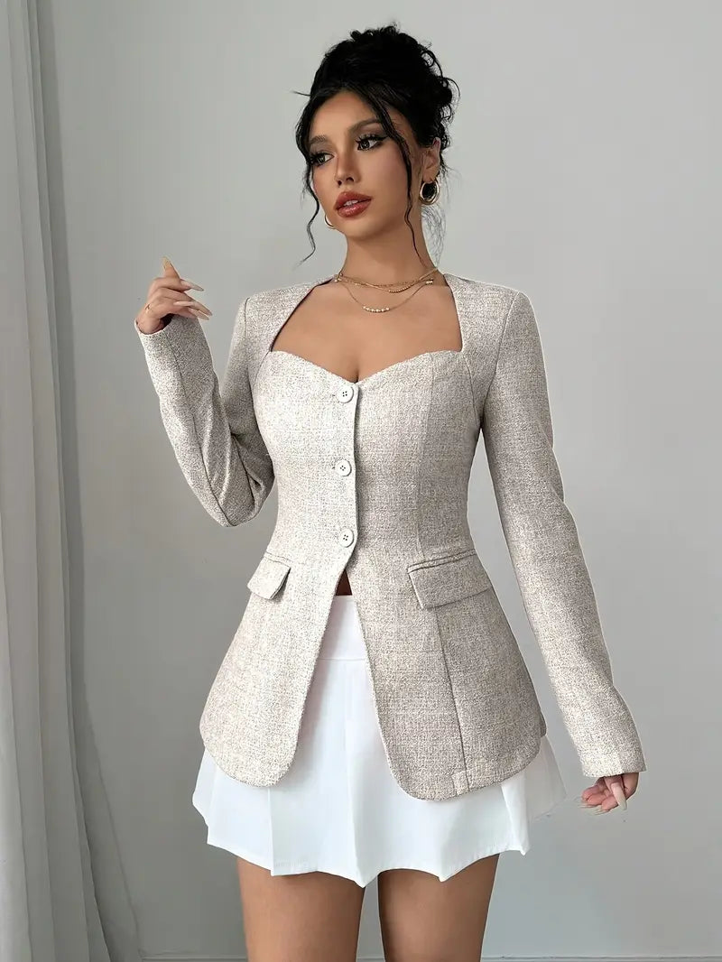 This buttoned jacket highlights the silhouette with its fitted cut and modern square neckline. Perfect for an elegant and feminine look, it can be worn both at the office and for outings. Its neat design and delicate buttons add a touch of timeless refinement to your outfit.
