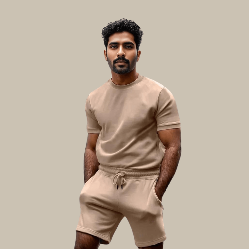 Una camiseta de manga corta, corte moderno, combinada con un pantalón corto con cordón ajustable y prácticos bolsillos laterales. Un conjunto perfecto para días relajados, sin comprometer el estilo. Confort asegurado, apariencia cuidada.