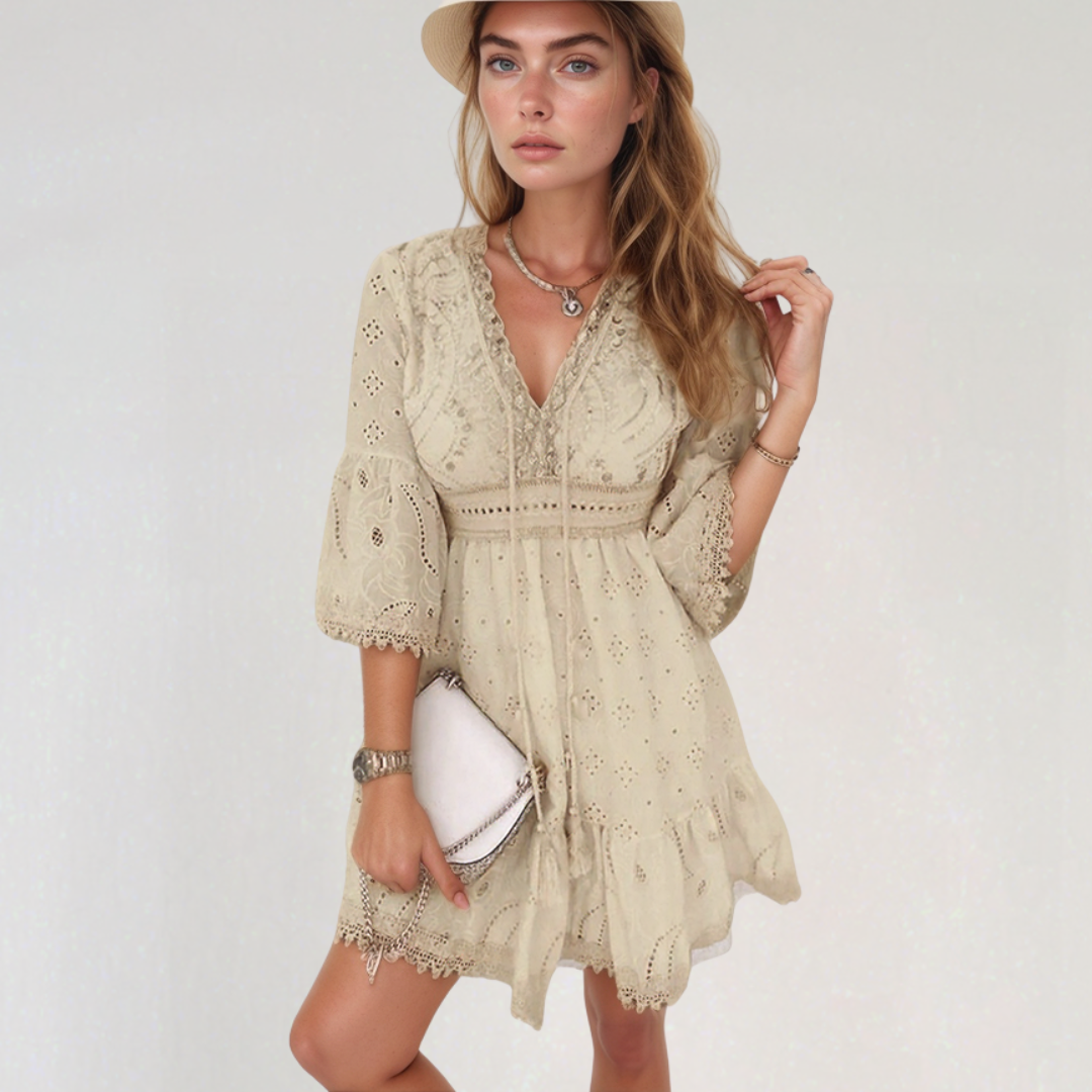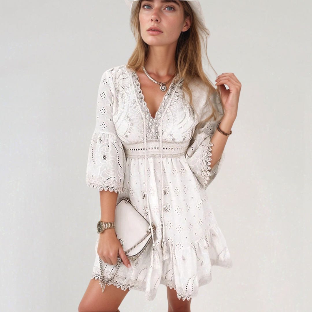Ghislaine | Robe Courte Bohème – Broderies Délicates Et Col V