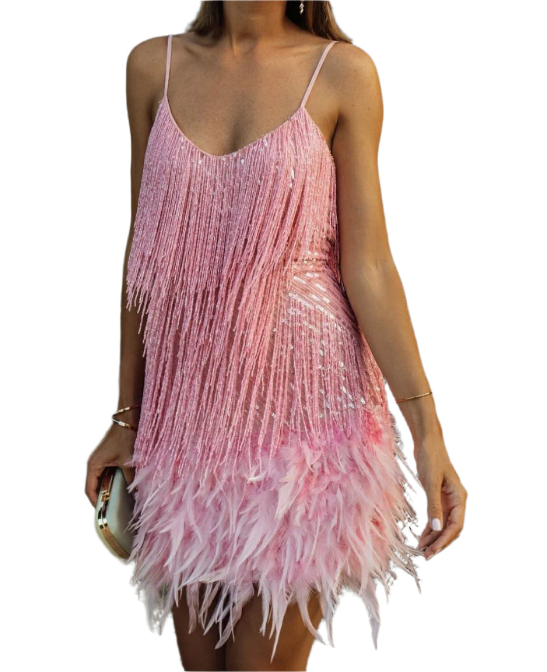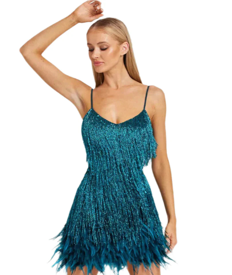 קלריס | שמלת מיני זוהרת עם ציצים ונוצות