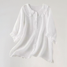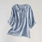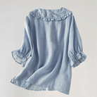 Questa camicia leggera presenta un colletto a volant elegante e maniche a tre quarti per uno stile estivo informale. La sua vestibilità ampia assicura un comfort ottimale per tutta la giornata. Perfetta per diverse occasioni, si abbina facilmente a vari pantaloni.