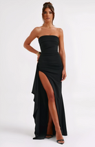 このストラップレスのロングドレスは、フィット感のあるカットでエレガントにシルエットを引き立てます。洗練された背中のデザインと高いスリットが、歩き方を引き立てつつ、抑えられたセクシーさを加えます。スタイルが全てを変えるシックな夜や特別な場面に最適です。
