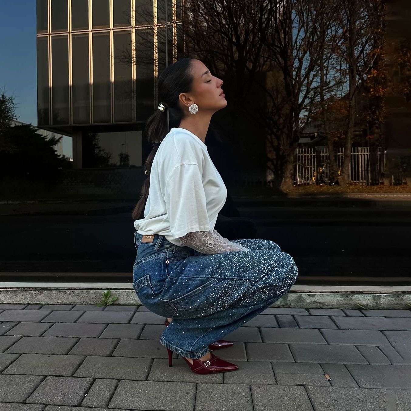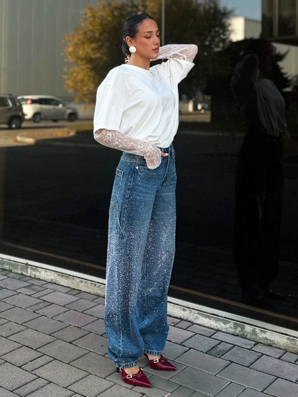 メイ | パンツファッション – リラックスしたカットと光沢のある仕上げ