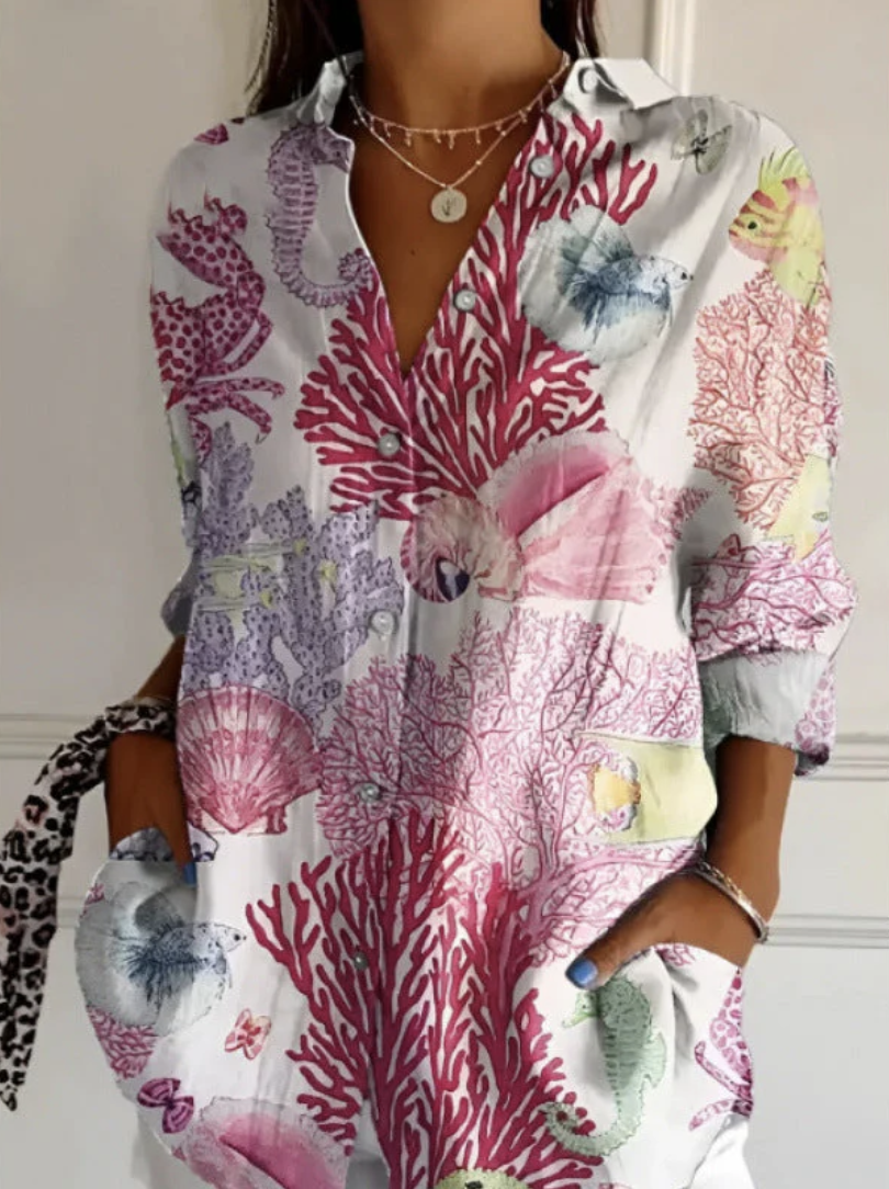 Táto vzdušná blúzka sa vyznačuje svojím umeleckým potlačou a ležérnym strihom, ktorý jemne kopíruje vaše pohyby. Ideálna na slnečné dni alebo neformálne výlety, kombinuje pohodlie a originalitu s jemnosťou. Jej bohémsky chic štýl sa prispôsobí všetkým vašim túžbam.