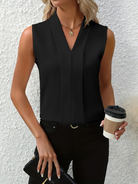 Tento bezrukávový blúzka spája diskrétnu eleganciu a funkčnosť. Jej čistý strih sa hodí ako na kancelársky outfit, tak na uvoľnenejší vzhľad. Nevyhnutnosť dámskeho šatníka.